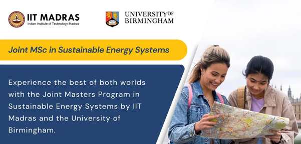 The Joint Masters Program in Sustainable Energy Systems, offered by IIT Madras and the University of Birmingham, is an 18-month academic journey starting at IIT Madras in Chennai and continuing at the University of Birmingham. The program provides invaluable international exposure, featuring opportunities for industrial placements and a year-long research project co-guided by expert faculty from both institutions. After completing the second semester, students can tailor their experience by choosing between two tracks, allowing further specialization. This unique program is designed to equip students with the skills and knowledge needed to lead in sustainable energy, making a meaningful impact on our planet’s future. Learn more